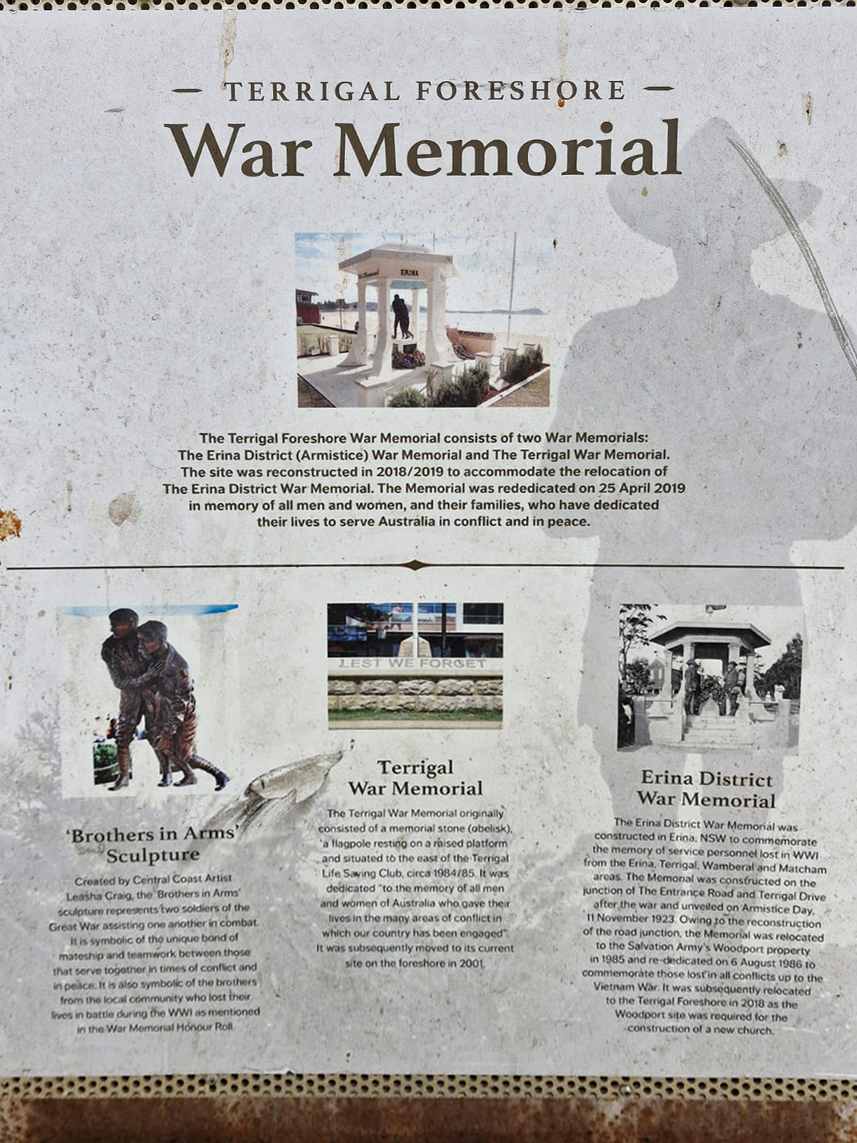 The Terrigal Foreshore War Memorial consists of two War Memorials: The Erina District (Armistice) War Memorial and The Terrigal War Memorial.