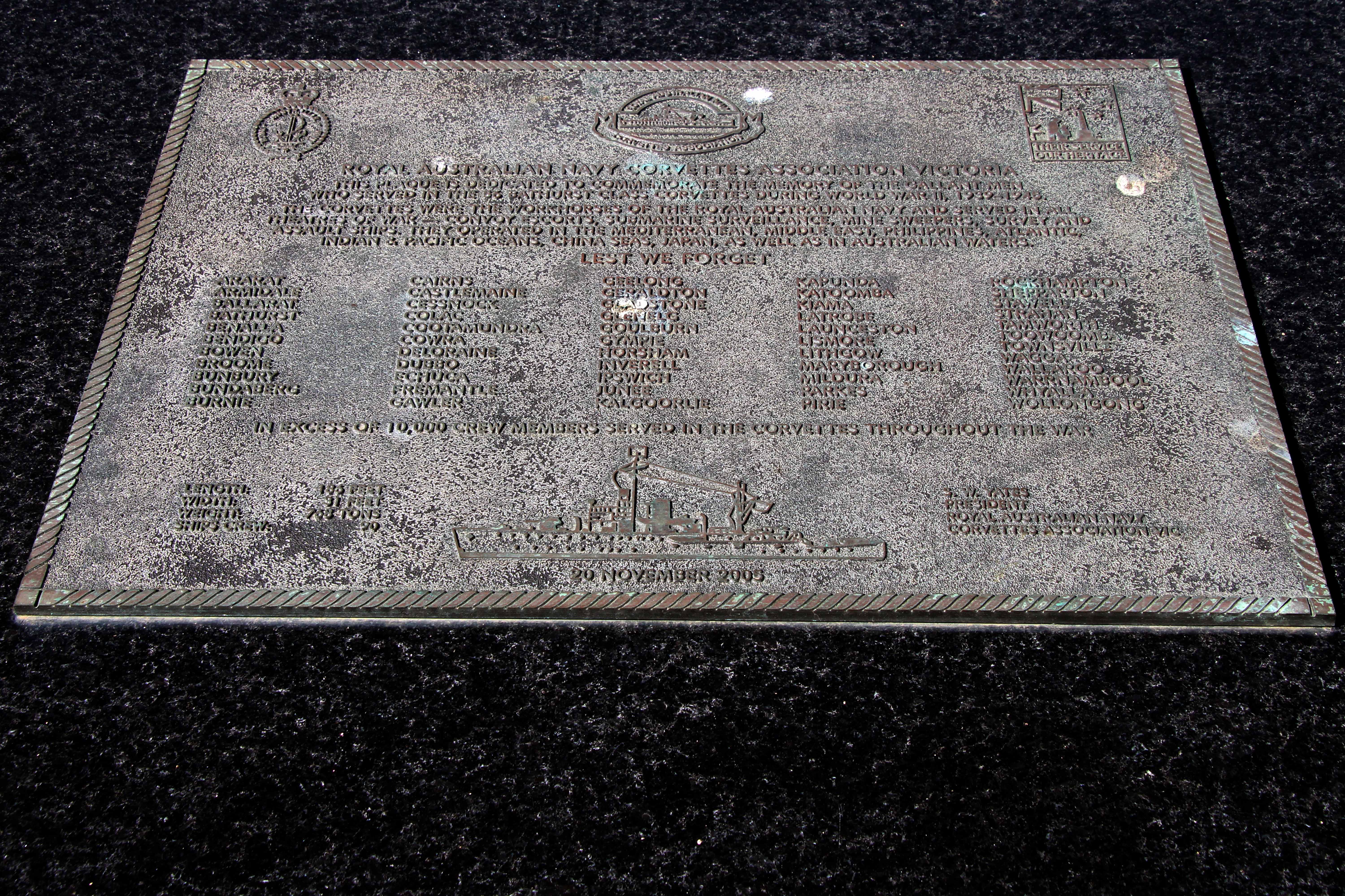 RAN Bathurst Class Corvette Association Victoria Memorial