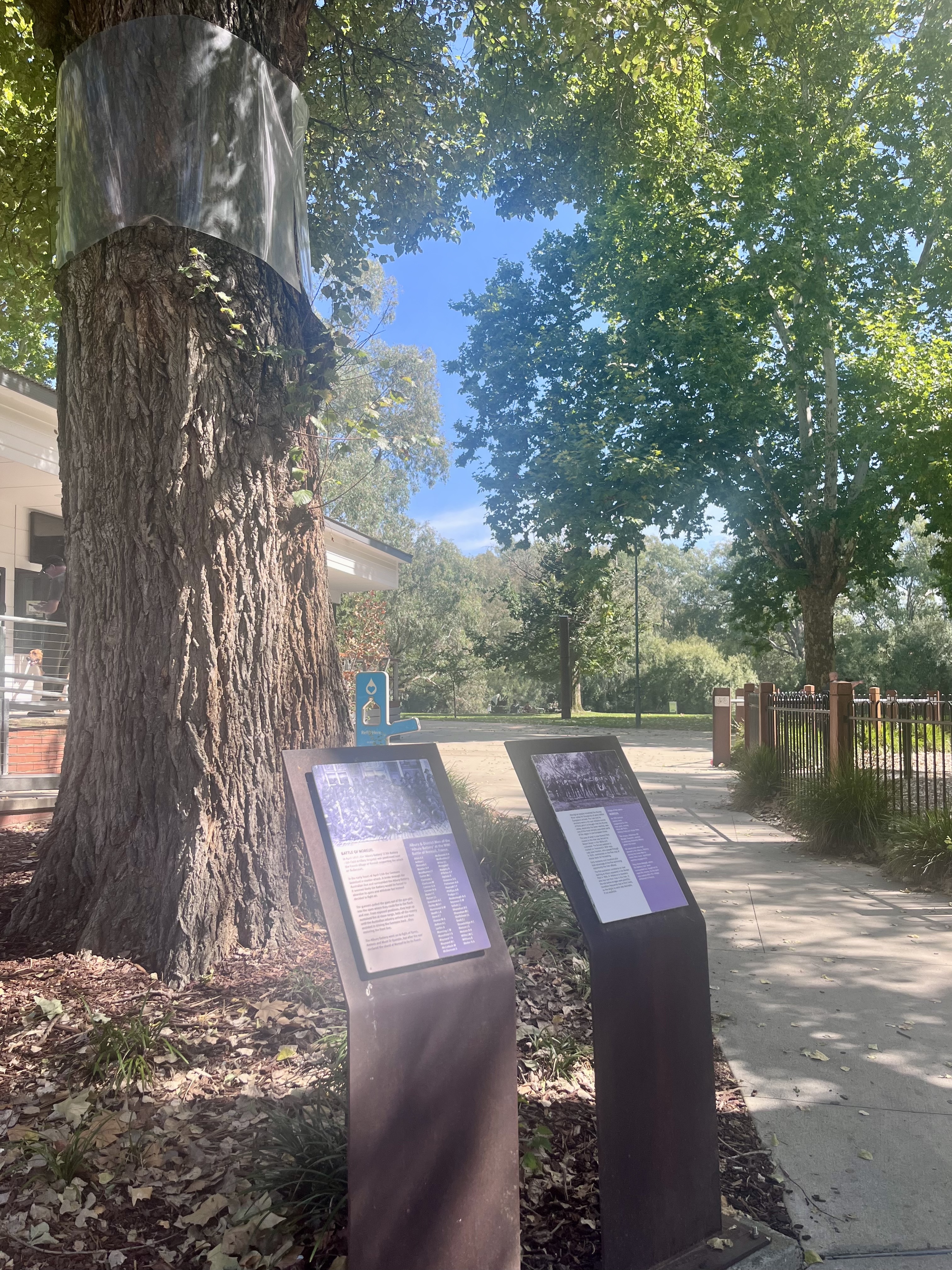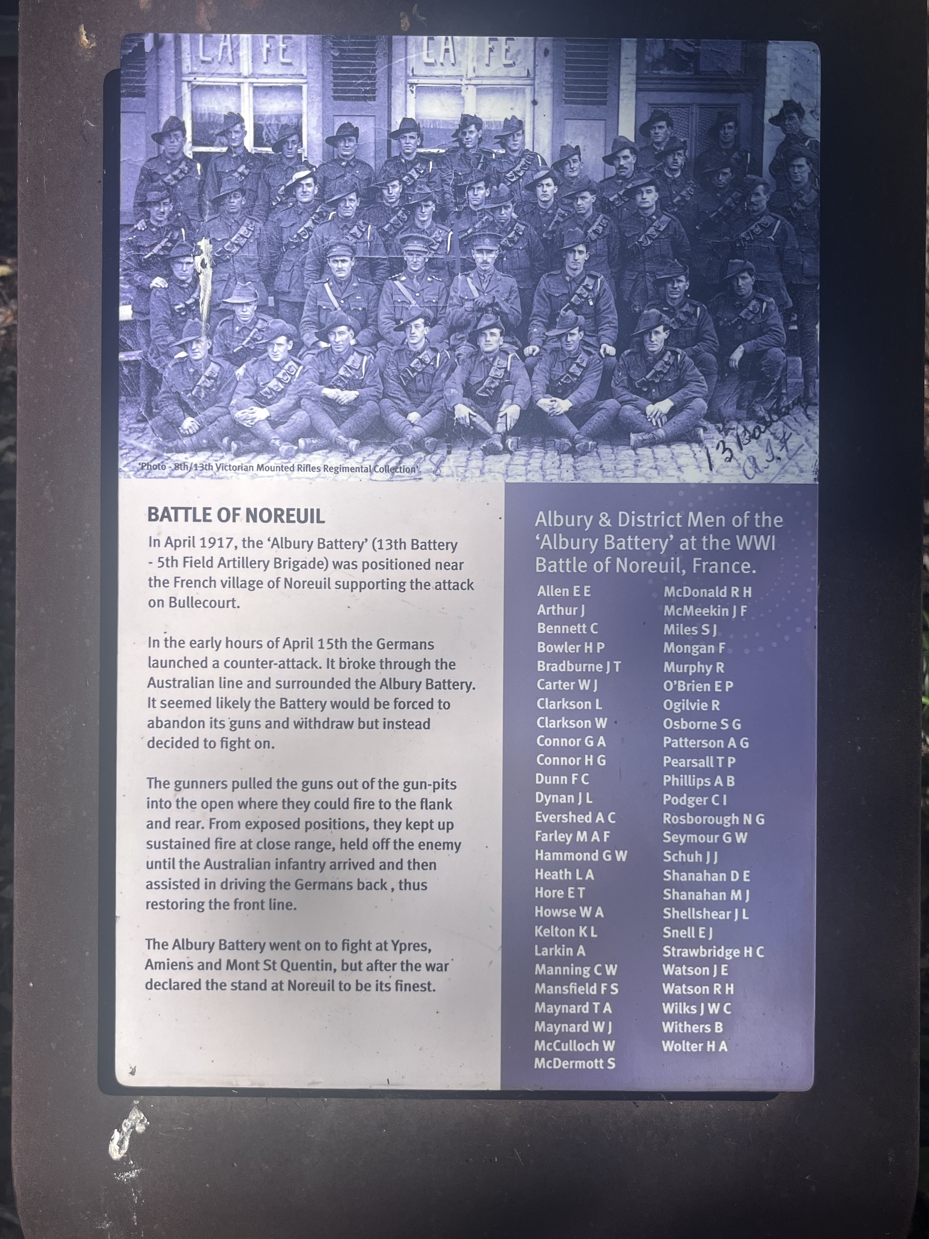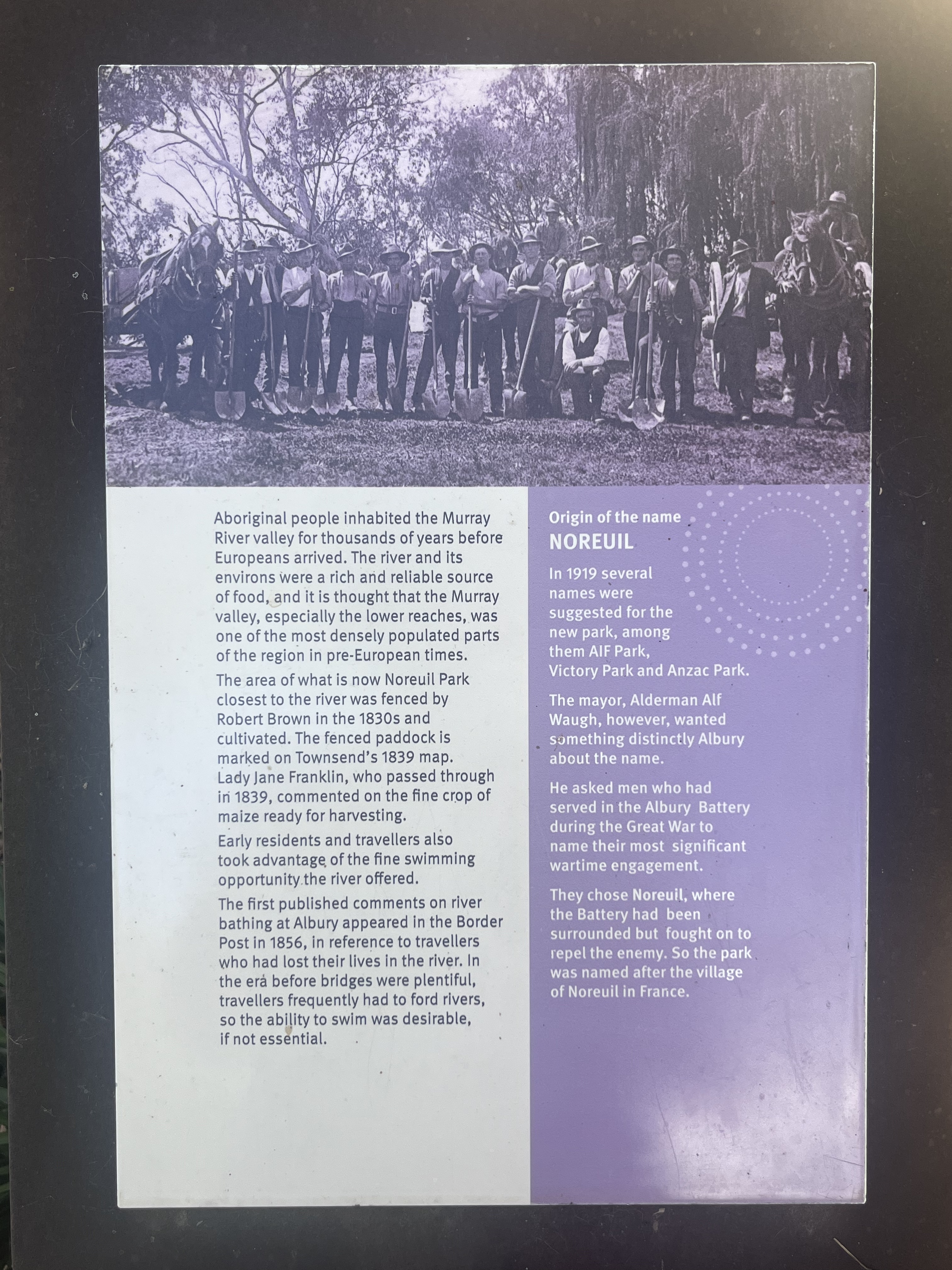 According to the information panels erected within this picturesque riverside park, the name 'Noreuil' was selected in homage to the men of the Albury Battery (13th Battery, 5th